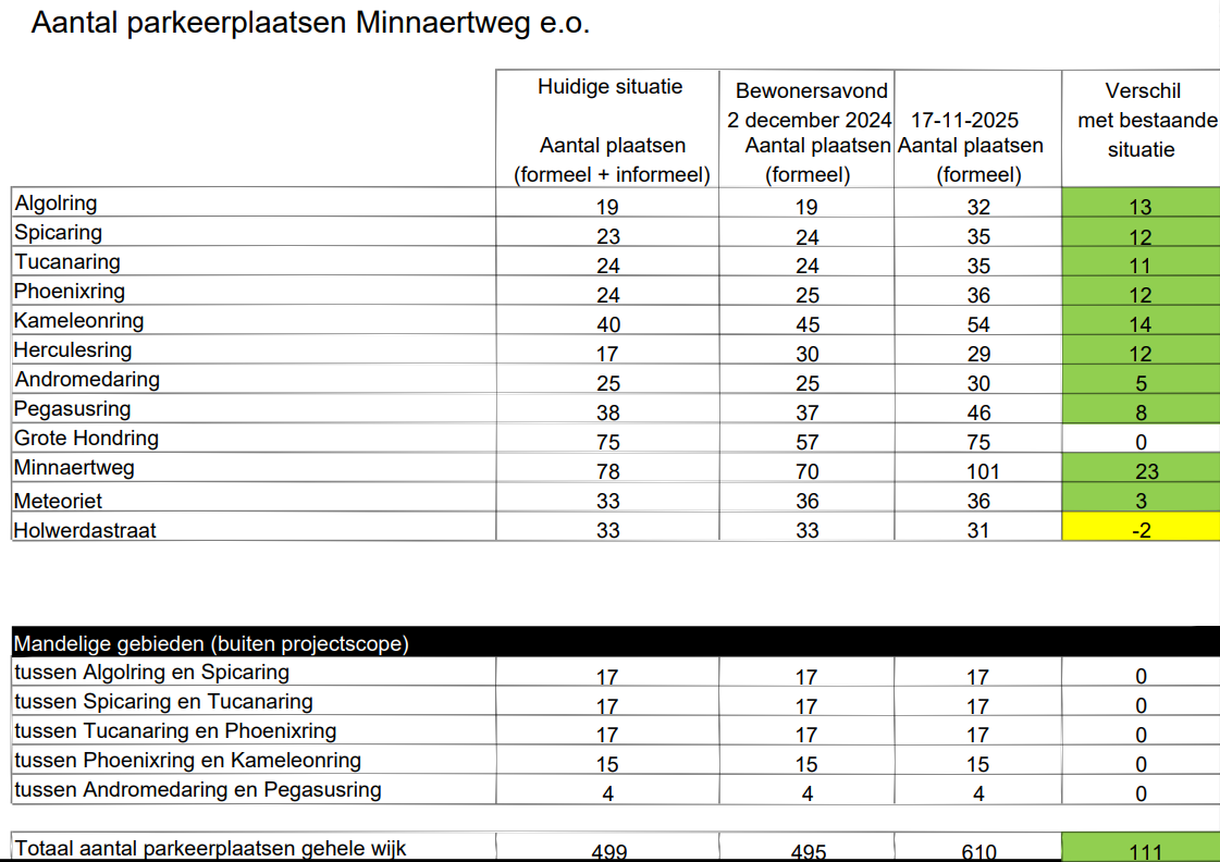 Hieronder ziet u het overzicht van het aantal parkeerplaatsen per straat (stand van 17 november 2025) en hoeveel plaatsen er sinds 2 december 2024 zijn bijgekomen. In totaal zijn er 111 parkeerplaatsen toegevoegd, waardoor de wijk nu 610 parkeerplaatsen heeft.